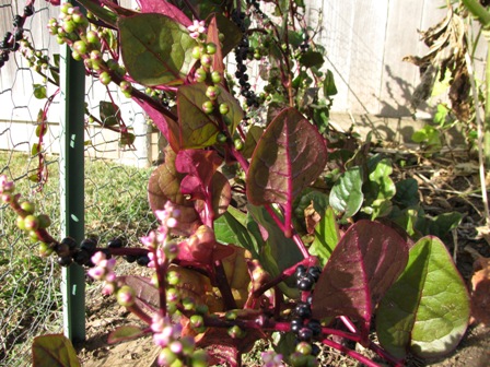 I later learned that Malabar is not a true spinach; either way, I think this is the Perfect Plant. The thick leaves are delicious — similar to spinach but without that gritty taste — and smooth, so they’re easy to wash. They’re pretty, too, a nice glossy green with a maroon shadow underneath. (I have a cultivated variety called “Rubra.”) The vine has striking dark purple-red stems, and seems to bloom all the time: little pink spheres that mature to shiny black berries. As the older flowers mature, the stalk keeps growing and putting out new blooms at the end. I recently discovered that the last couple of inches of flower stalk is just as tasty as the leaves, and makes a pretty salad garnish.