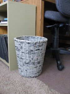 Then one day we happened to be in a Container Store in north Dallas, and I noticed these really cute wastebaskets woven of newspaper. A brilliant idea began to take shape. Maybe I could have… my own wastebasket! Beside my own desk! Think of the time it would save! And what could be more perfect than a really cute one woven of newspaper? Minutes later, the deal was done.