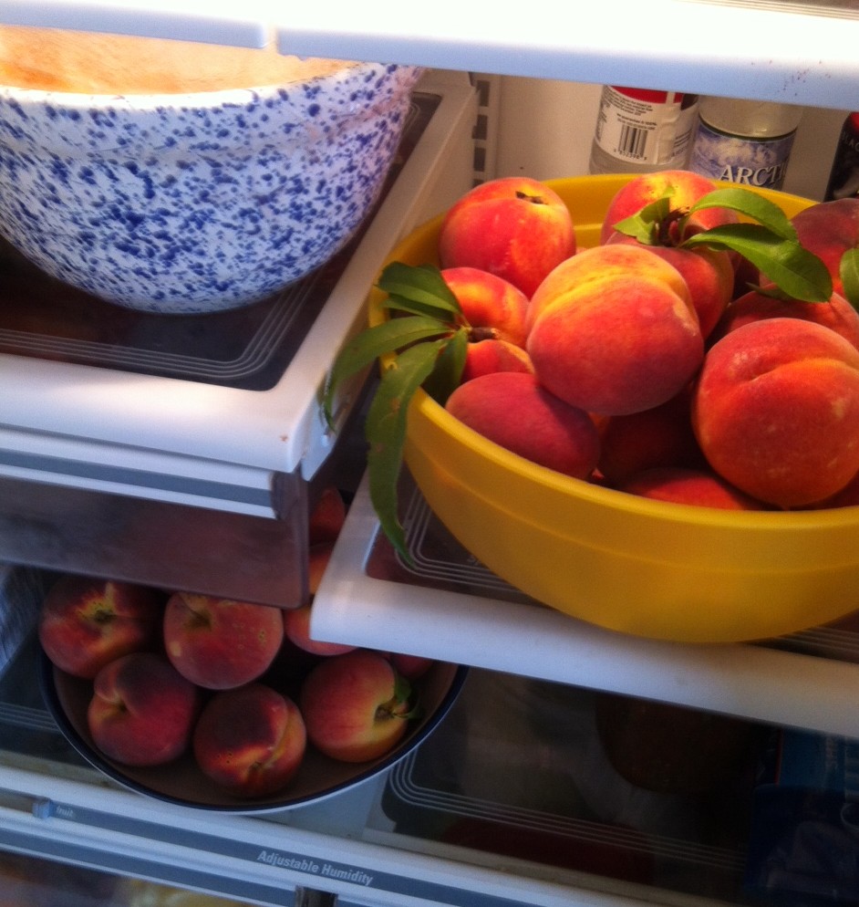 Lunch-bag by lunch-bag, I’m taking peaches to the neighbors and making room in the fridge for tomorrow’s picks. The bounty is overwhelming and keeps me from writing as much as I should, but I’m going to enjoy it while it lasts. After all, I can always spend more time writing when the tree is covered with nothing but leaves.