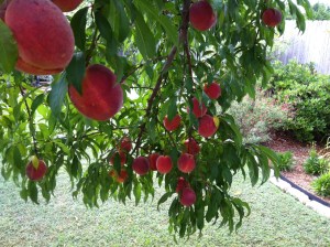 We have one peach tree in our back yard. In last summer’s drought, the peaches were skimpy and ugly, plus we had to arm-wrestle the bugs for the few that ripened enough to bother with. We ended up with just about enough peach fragments to top a couple of bowls of ice cream.