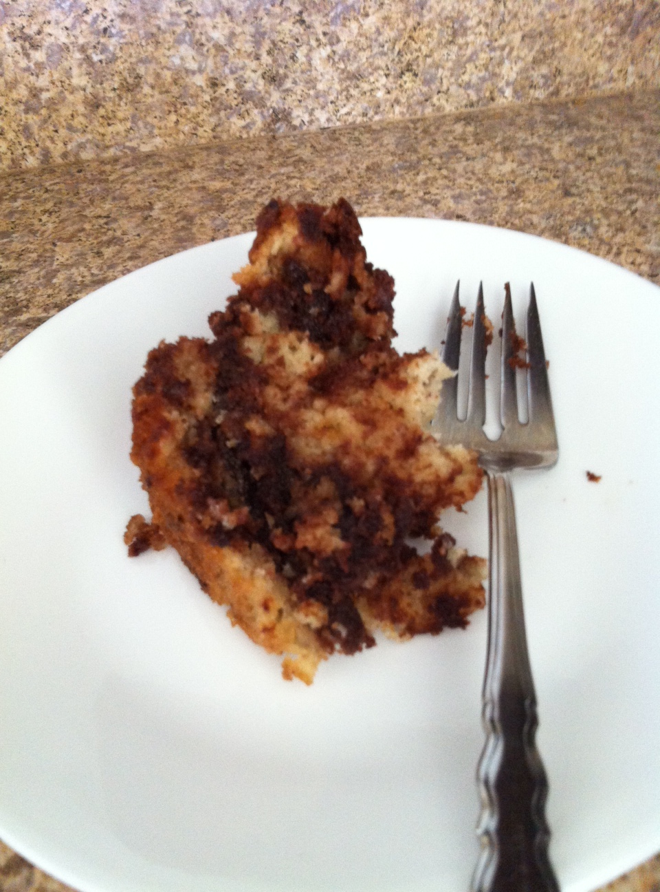 Mix a cup–no, 1/3 cup–of the batter into the Nutella, then swirl the two batters together. Uh-oh, the custard dish is the right diameter but is not near deep enough. Sigh. Switch to whatever size pan looks like it should hold the stuff.