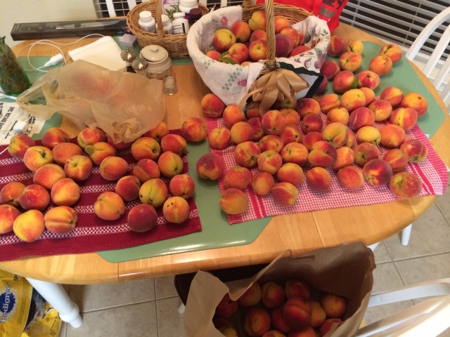 No time to chat… but this summer’s peachfest is almost exactly like the one we had two years ago, except the tree is bigger. You can just read about it by clicking this link: “It’s the Pits… But I Love It”