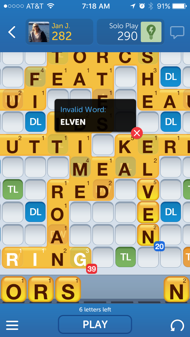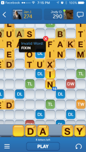 Arguing with the Word Sheriff in the “Words With Friends” app. Here, you see the game discriminates against both Texans and Lord of the Rings nerds. The indignity!