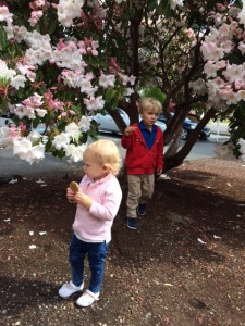 The exuberant display of flowers on this shrub on the lawn of the family’s church. It was a great place for the kids to enjoy their after-church cookies. Bonus: It’s big enough to climb.
