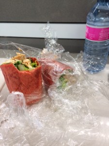 The quick Caesar wrap I grabbed at Sea-Tac Airport before my flight home. In a commendable effort at maintaining freshness, someone had rolled the poor thing in Eight Layers of Micro-thin Plastic Wrap (yes, I counted as I unrolled) before encasing it in a cellophane overwrap. The overwrap was fastened with a sticker and roughly a teaspoon of Super glue. Seriously, I thought I wouldn’t be able to infiltrate to the actual food until time to board.