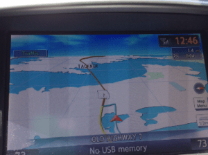 His rental car had the add-on navigation system, and my Infiniti of course has the latest version of GypsE ROSE. What could go wrong?
