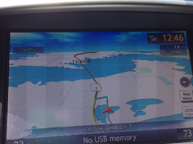 Soon I saw the store. Something stood between me and it: Highway 7 and some fast-moving traffic.”Not walking across that.” Back over the bridge and into the car. As soon as I turned to retrace my route, the map guidance changed to show me taking Highway 7 into town and turning onto Main.