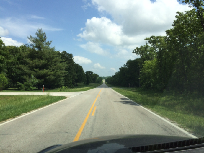 My route meandered up state highways alongside the Truman Reservoir before veering off onto a local road that approached town from the “back” side. At length I came to Highway 7, where I expected to turn right. But GypsE ROSE said to cross it.