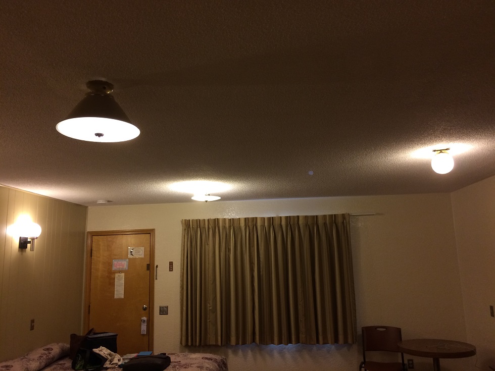 I’d unpacked my necessities and was getting comfy when my gaze strayed to the ceiling. My room had three ceiling light fixtures, plus one wall fixture above each queen-size bed. The wall fixtures were a pair, but. . . the ceiling. . .