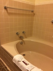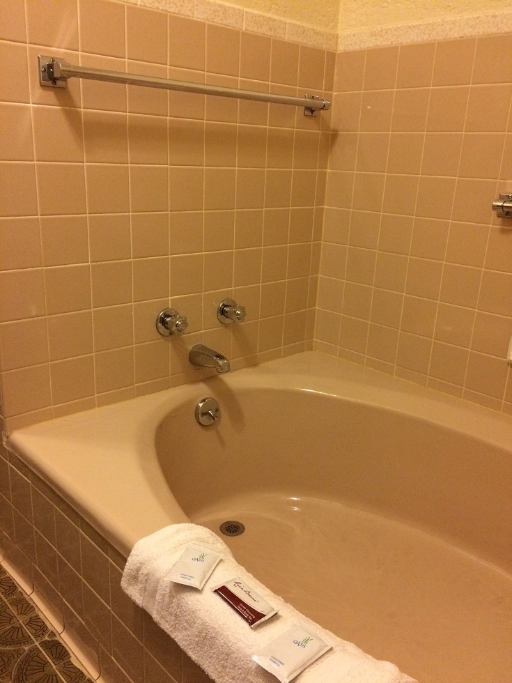 The bathrooms in this place are legendary. They are huge, with the shower and toilet in one section, a separate tub beyond that, and finally, a long counter with two sinks. In true retro fashion, the tub and toilet are colored in hues to match the wall tiles. (Mine were a sort of weird Band-Aid pinkish-beige. Last time I stayed here, I had a Chevy Bel-Air blue bathroom.)