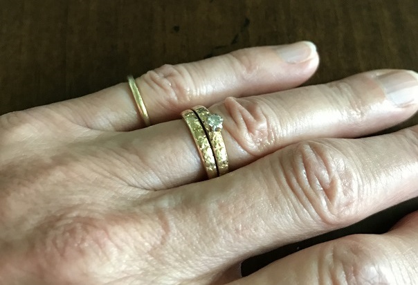 First, Brent and I shopped together for our rings. He “popped the question” some months later, on the Texas A&M campus. The gold and diamond represent his geology major. The flowers embossed on the bands (they’re on Brent’s band, too) represent my floriculture major. Oh–the ring on my pinky is my mother’s wedding ring, which I recently started wearing.Then of course you have wedding invitations printed. We keep a framed copy on a table next to a photo from our reception.