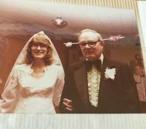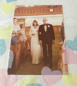 At last the Big Day arrived. My dad walked me down the church aisle, over little tissue paper hearts that we fixed for the flower girl to scatter, because rose petals might stain the snazzy new apple-green carpet. Yes, I saved some of the hearts for the wedding album. Note: I can assure you Dad was a lot happier than he looks in the photo.