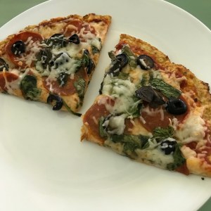 Another cauliflower idea was to make grain-free pizza crust out of it. Ohh-kay… I found a recipe online and made a small trial crust, adding eggs, spices, and two kinds of cheese to the main ingredient. You bake the crust first on parchment paper, then top as usual and bake the whole pizza.Result? A functional-but-soft crust that smelled like cabbage. It didn’t resemble bread so much as it did a frittata.