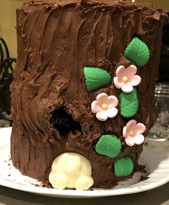 Heather’s mom made the frosting. Later, Brent assembled and frosted the cake. Can you tell it’s a tree trunk? Heather placed a candy “bunny butt” as if the little guy were diving into his burrow beneath.