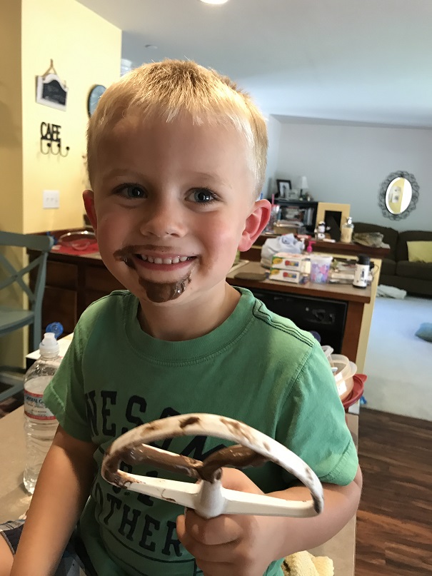 Mommy Heather had some super cute ideas for the birthday cake and party. We all pitched in for the fun prep work. Observe the goateed “Celebrity Chef” as he assists with cake batter production.