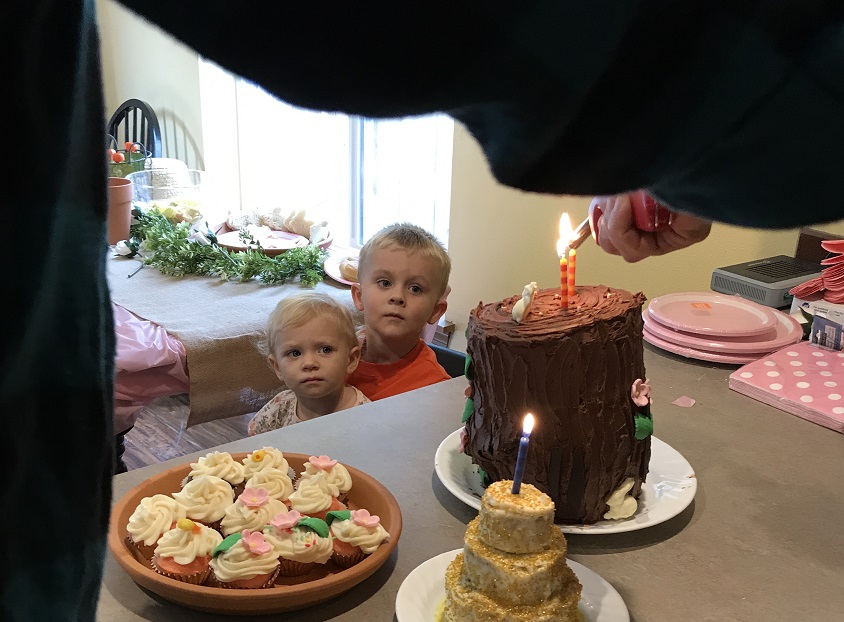 After a yummy lunch, it was time for Daddy to light the candles. This appears to be a matter of some concern for Birthday Girl and her brother.