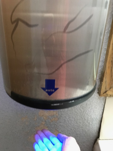 I regained my balance. Thankfully, both the shrill engine noise and the blue light faded away. Once my heart started beating again, it dawned on me that the “paper towel holder” must really be a warm-air hand dryer.