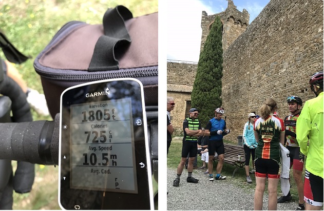 The next day, we rode to a town called Montalcino. Please note: when riding to a place in Italy whose name starts with the letters “Mont-,” don’t expect the road there to be flat. As you can see from my elevation reading (below left), this wasn’t exactly a Rocky-Mountain level peak. I mean, there was air at the top, and all. But talk about steep!