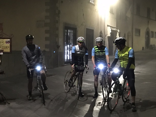Next morning started waaaay early. Brent bravely chose to do the long route, about 80 miles. Here he is with the other hardy souls before they rode down to Gaiole for the start. He’s the one in the middle, whose light, um, didn’t work.