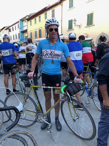 As for me, I rode my nice new Bianchi to Gaiole–after sunrise, thank you–and enjoyed the village all morning. Best of all were the participants dressed in period costume. Plenty of them wore retro jerseys, but some folks went all out…