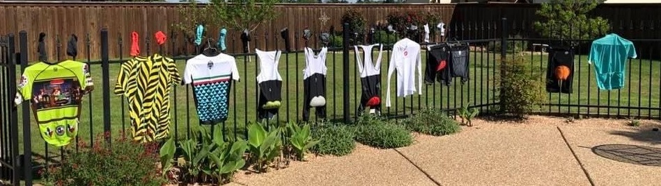 After two hours of looking at machines/considering pros & cons, I came home to find the bikewear all rinsed and neatly hung on the pool fence. Don’t worry; those little things on the spikes aren’t shrunken heads, just our cycling socks.